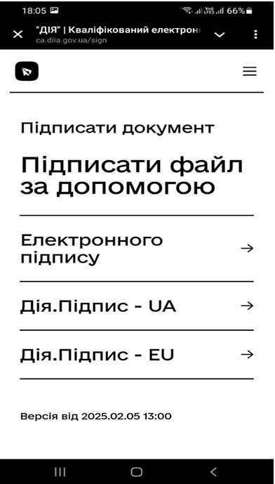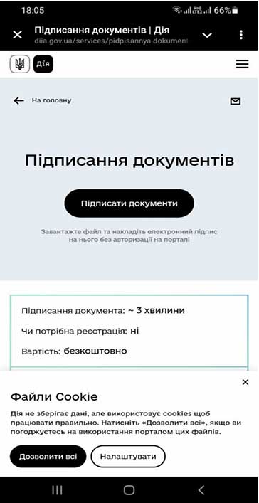 Файл, який треба підписати, потрібно зберегти в Файли на телефоні. Проходимо за посиланням https://diia.gov.ua/services/pidpisannya-dokumentiv
